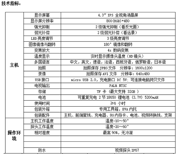 2、6mm雙鏡頭獨有的環(huán)境溫度檢測功能,同時檢測環(huán)境溫度超過75攝氏度,將自動斷開攝像頭電源,有效保護插入管;